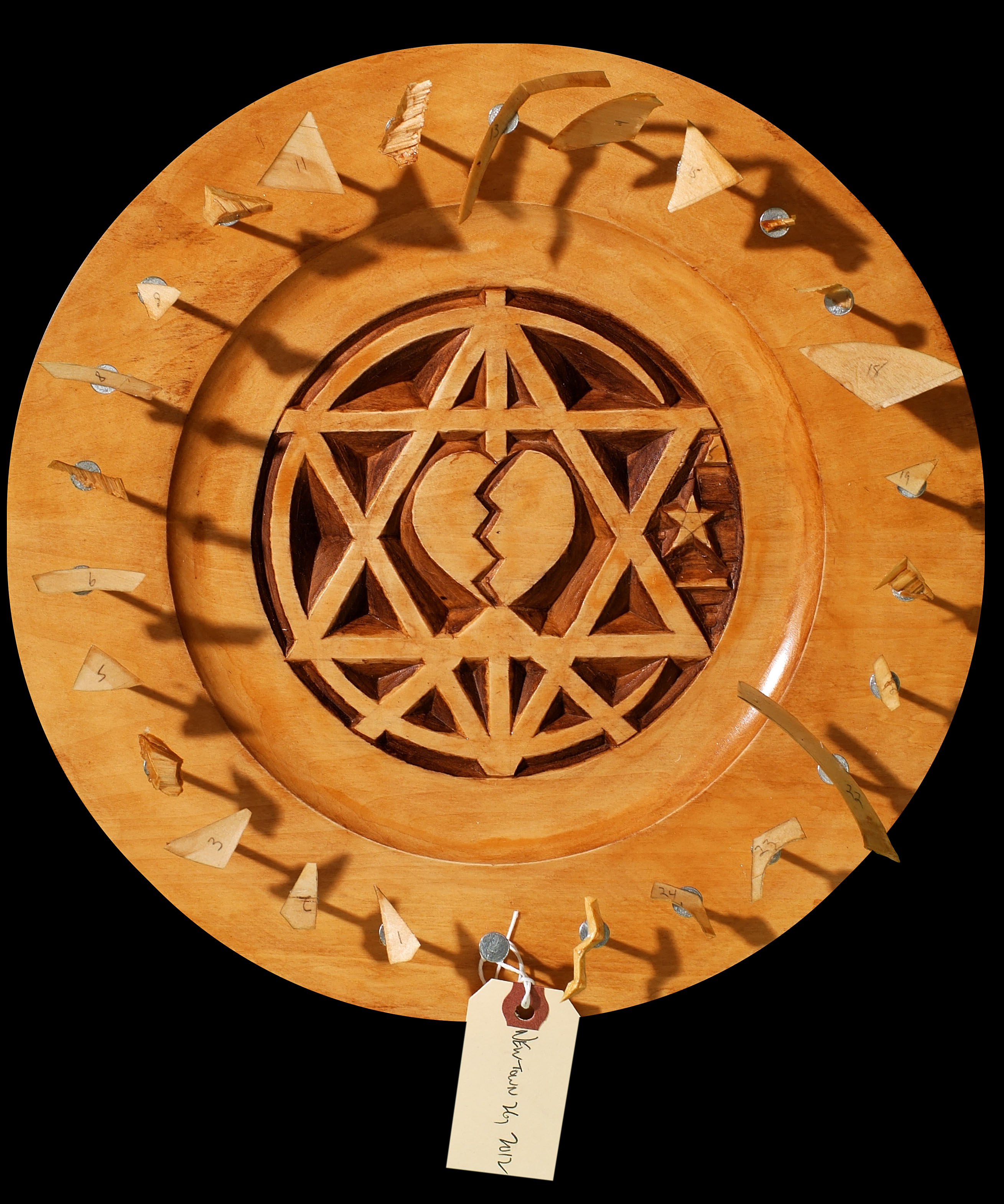 Harvey removed 26 chips of wood from the inside of a plate and reinserted them onto the outside to create Newtown 26, 2012. This carving raised over $2500 for mental health services in Connecticut. To date, he has donated over $6000 to support Jewish Family Service and its vital community programs. |
