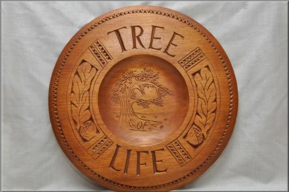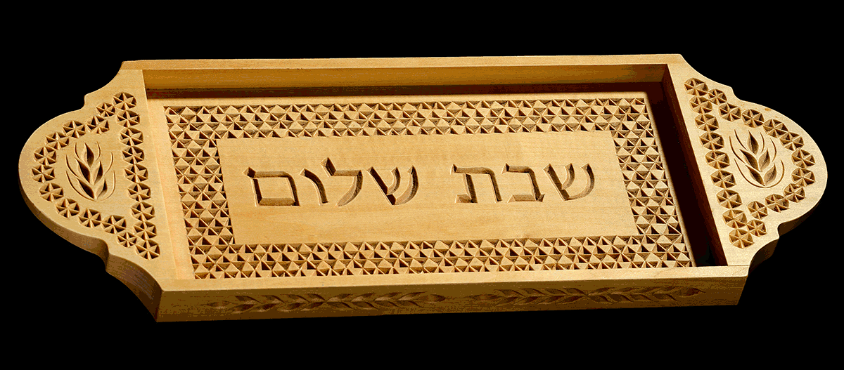 Now Mount Sinai was all in smoke, for the Lord had come down upon it in fire. The smoke rose like the smoke of a kiln, and the whole mountain trembled violently. Exodus 19. This 2 foot by 2 foot carving pushes my “modern phase” even further. Except for the border, which utilizes traditional chip carving technique, most of the remaining cuts (mountain, sky and tent coverings) were carved utilizing non-traditional techniques which I believe created interesting textures and cuts that I have not seen before in chip carvings. |