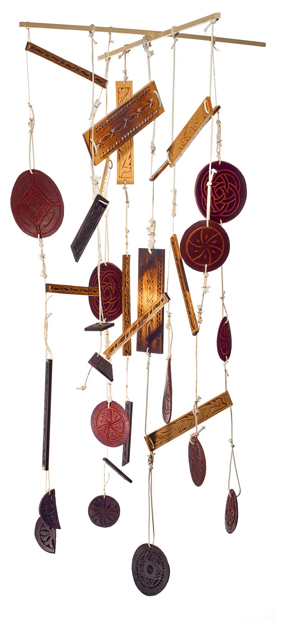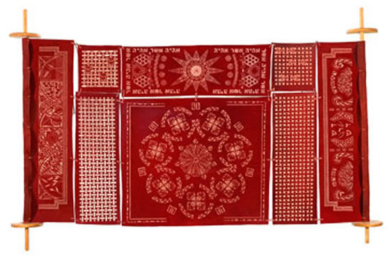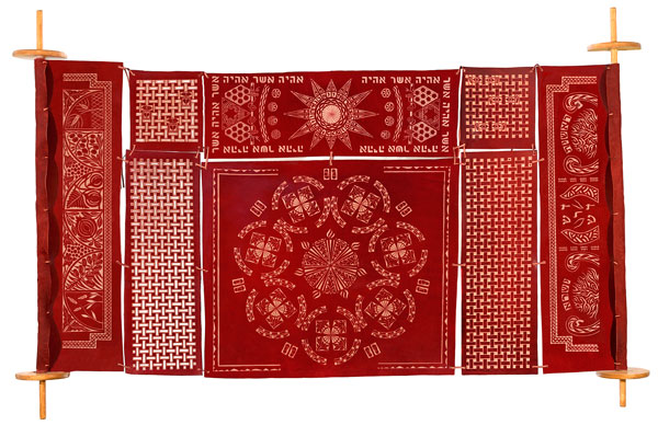 Last year’s visits to DIA Beacon and Mass MOCA started me thinking about installation art. I immediately saw the possibilities of carving scenes from the Book of Exodus as a leather scroll resembling the Torah. Phase 1 –The Burning Bush and the Etzei Chaim Wooden Staves Motifs - Right to left |