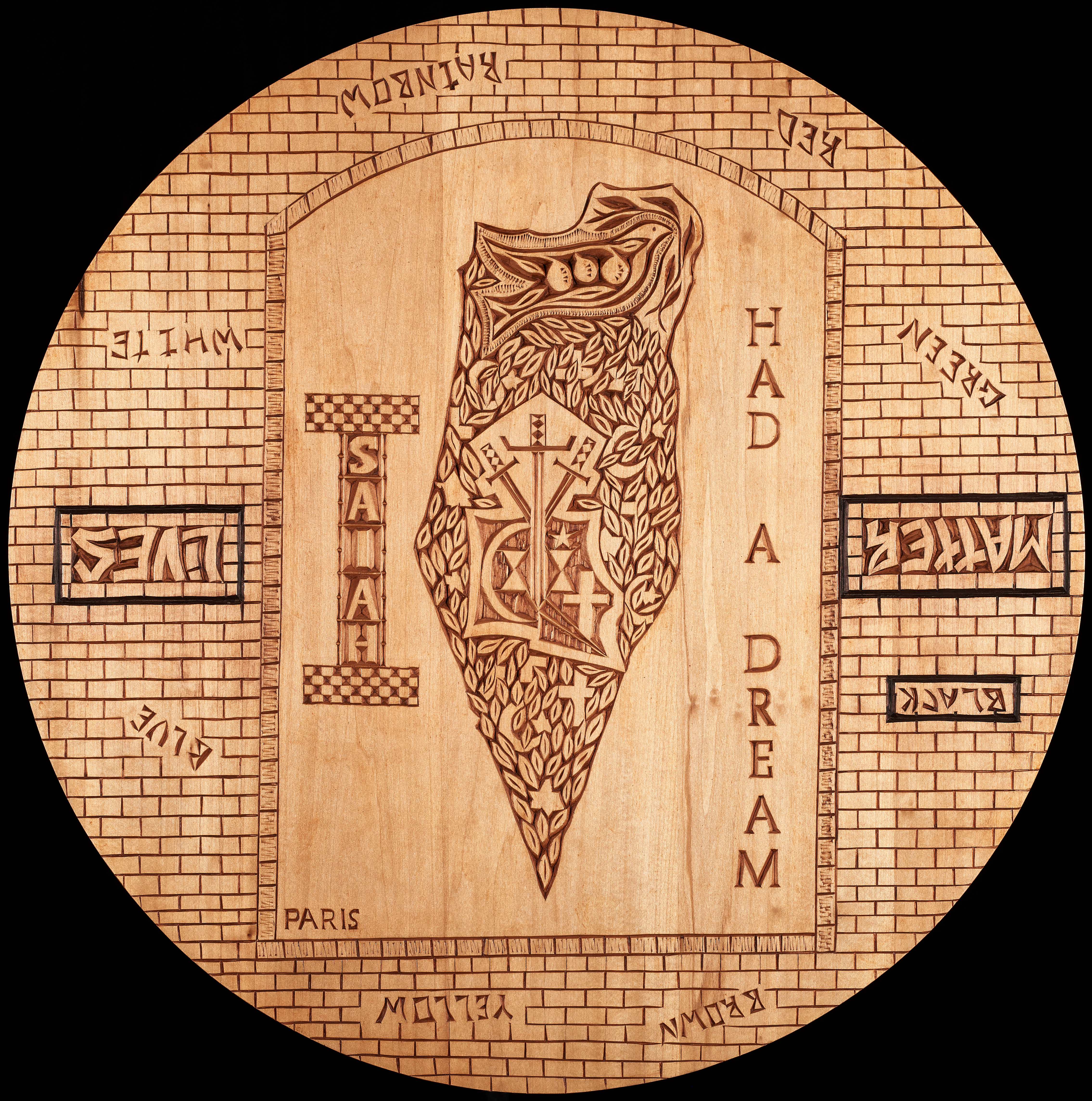 I(SAIAH) HAD A DREAM- Originally carved in 2017 on a 30” circle of wood, this piece was up-dated in 2020 to reflect the importance of the Black Lives Matter Movement. As implied by its name, it refers to the visions of peace of both the Prophet Isaiah in Israel and to Martin Luther King in America. |