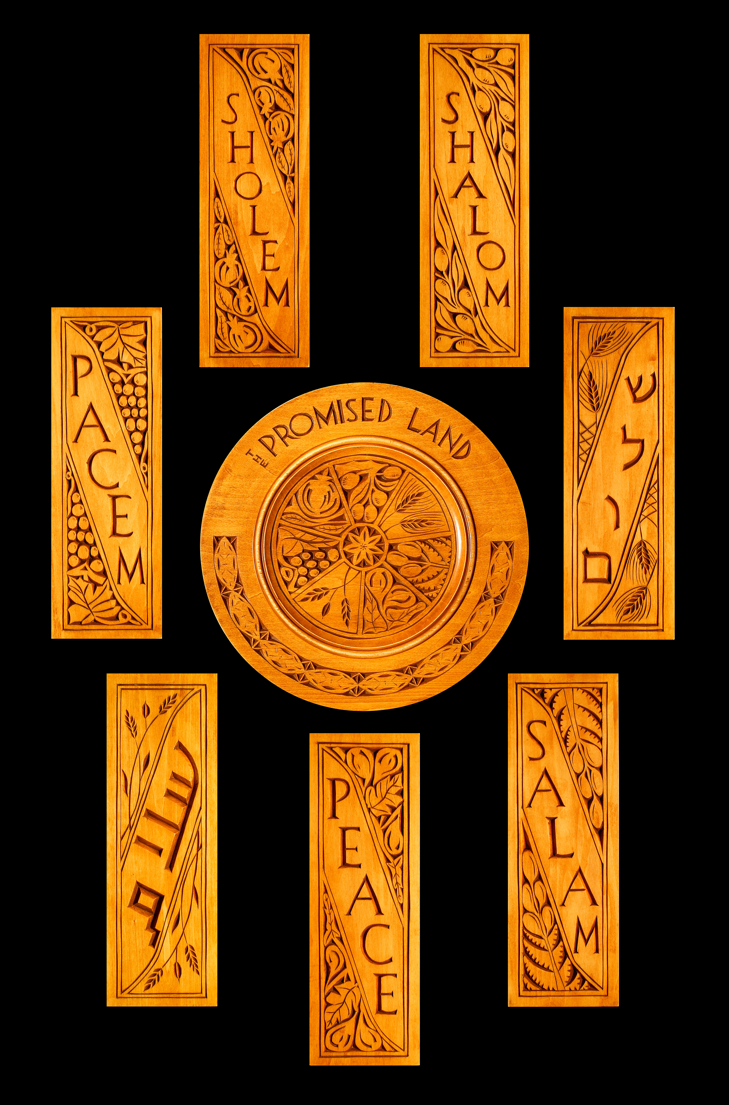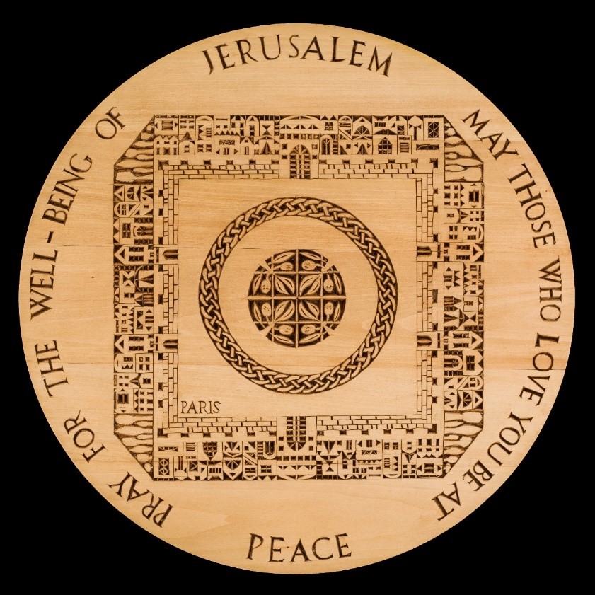This large bass wood carvings (30’ x 30’) was completed in 2023. Psalm 122:6 is carved as the border with the homes of the residents of Jerusalem highlighted beneath the psalm. Inside the city are symbols of peace. The obvious olives and branches are bordered by a never ending three stranded circle representing Jewish, Muslim and Christian inhabitants all living in harmony. That is worth praying for! |